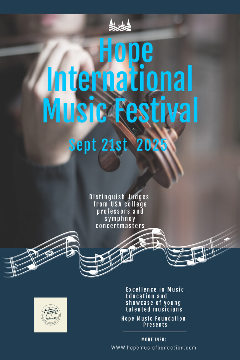 The Hope Music Foundation is a non-profit organization. The mission is to promote music charity and music education within communities. The organization empowers children to use their musical talents to give back, bringing peace, hope, and joy to people's hearts.